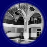 elaborate painted mosaic design of bathing beauties grace the arched ceiling.